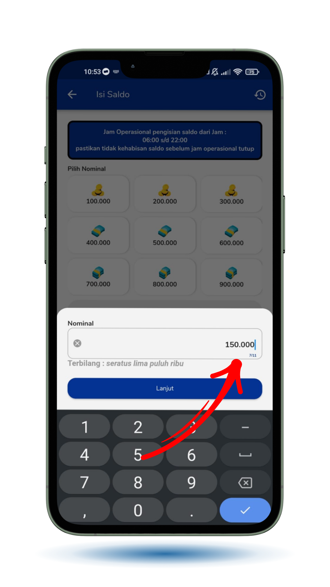 Masukkan nominal saldo , minimal Rp10.000 aja, pas banget buat kebutuhan harian.